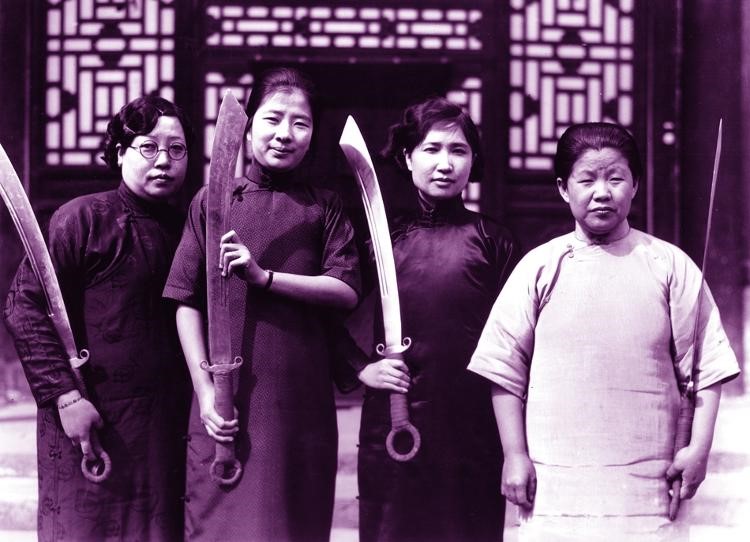 1933年,日本关东军向山海关发动进攻,长城抗战由此开始。抗战期间,华北妇女界代表来到喜峰口前线慰问英勇抗日的第29军官兵,图为四名妇女手持第 29 军战士的大刀合影。