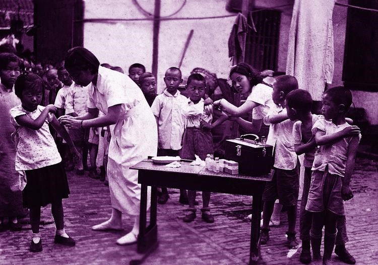 1937年“八一三”淞沪会战期间,难民救济所的医护人员在给儿童打预防针。