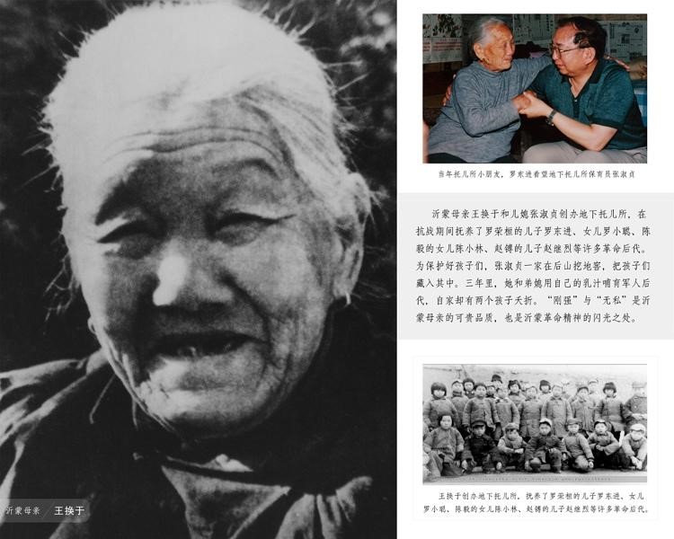 “沂蒙母亲”王换于是沂南县岸堤镇圈里村人,1938年加入共产党,被选为村妇救会长和副乡长,还担负起了抚养革命同志的孩子的任务。对于战时托儿所里的每一个孩子,王换于都用生命来呵护。有一次,王换于去西辛庄看望寄养的革命后代,发现孩子瘦得不像样,她一阵心酸,就将孩子抱回了家。当时,王换于的儿媳正在哺乳期,在抚养自己孩子的同时还要照顾这些孩子,奶水已不够吃。她说:“这些孩子有些是烈士的后代,让咱的孩子在家吃粗的,把奶给这些孩子喝吧,咱的孩子没了,还可以再生,咱可不能让烈士断了根呀。”