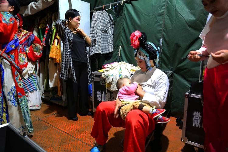 2018年5月21日,送戏下乡的演出现场,演出后台演员正忙着整理衣装准备演出,一位身着演出服的母亲在杂乱的后台给孩子哺乳,眼瞧着、摇晃着、手拍着、呢喃着,这是一幅多么温馨的母爱画面。为人父母,方知公众场合母乳喂养的伟大之处,因为妈妈遇见宝宝,会变得无所不能!这就是伟大的母爱!李捷摄。