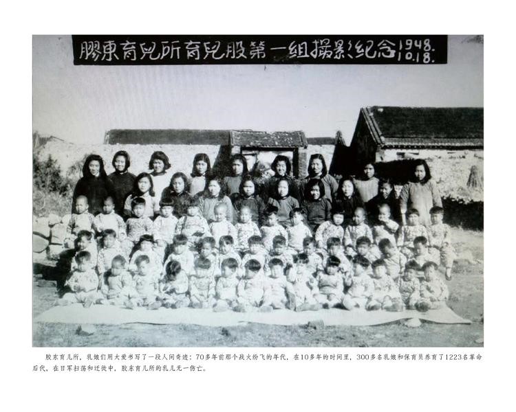 抗日战争最艰难的时期,八路军主力和党政军机关在突破日寇层层封锁中面临生死考验,被迫频繁转移。有的同志不得不抛下亲生骨肉,送给当地百姓带养,而其中有的孩子才刚刚来到人世。1942年7月,中共胶东区党委决定在牟海县组建胶东育儿所,选取乳娘哺育党政军干部子女和烈士遗孤。在极端艰苦的条件下,300多名乳娘和保育员养育了1223名革命后代,在日军“扫荡”和迁徙中胶东育儿所乳儿无一伤亡。