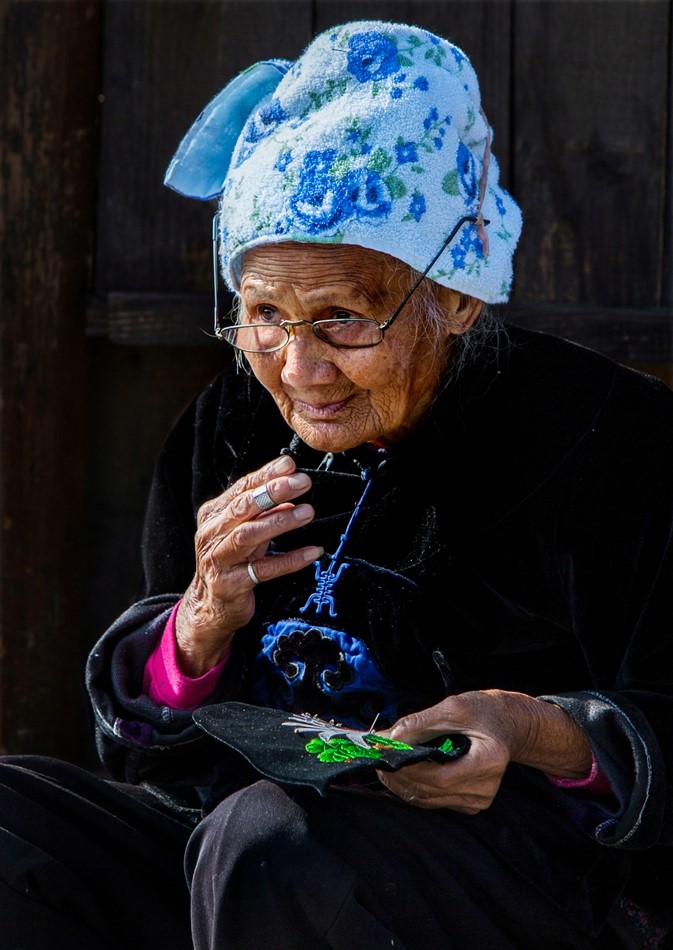 2014年10月22日摄于贵州黔东南西江千户苗寨。老人当年已98岁高龄,身穿民族服装,容貌慈祥,精神矍铄。每天在山顶上看着过往的游客在鞋底上绣花。虽然不会讲普通话,但不断和行人微笑着打招呼。她一生没出过大山,过往的游客让她认识到了山外五彩缤纷的世界。宋文勇 摄。