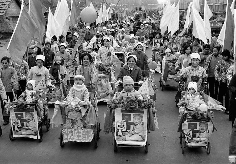 拍于1983年3月 地点周村区。周村丝织厂女工们为宣传计划生育用自家的木质小推车推着自己的宝宝上街宣传。陈勇提供。