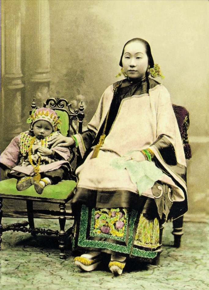 摄于1880年的这幅小像,母亲面庞宁静、慈爱,已属难得,也呈现了清末殷实之家女性服饰之美。金伯宏供图。