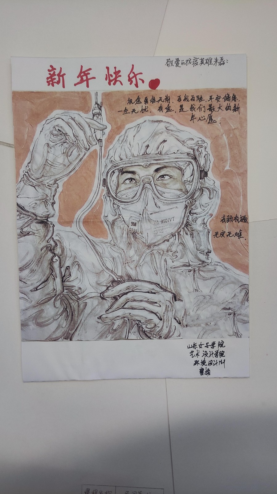 为我省援鄂医疗队队员绘制2021新年元旦祝福贺卡,表达全体师生对最美逆行者的感恩、感激、感谢与祝福。据山东女子学院艺术设计学院党总支书记于学江介绍,全院师生用3天多时间赶制出了1700多份手绘贺卡。这些绘画作品,有的采用水墨手法、有的采用油画技艺、有的采用勾线淡彩画法、有的采用复合材料、有的采用手工刻板印刷来表达主题,并且全部采用手写祝福语形式,也有艺术志愿者用自己写的小诗表达心意。