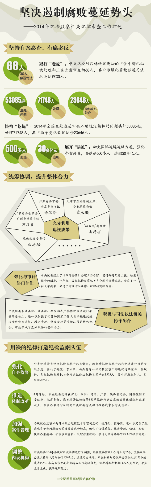 此外,中央纪委2014年再次对内设机构进行了调整,纪检监察室从10个增加到12个,直接从事办案工作的人员增加了100多名。通过两次清理,牵头和参与的议事协调机构从125个缩减为14个。各省区市纪委也坚持从工作实际出发,调整增加办案部门和人员力量,聚焦主责主业,提高履职能力。